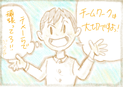 「皆さん、チームプレイを大切に、協力し合って仕事をしましょう。」